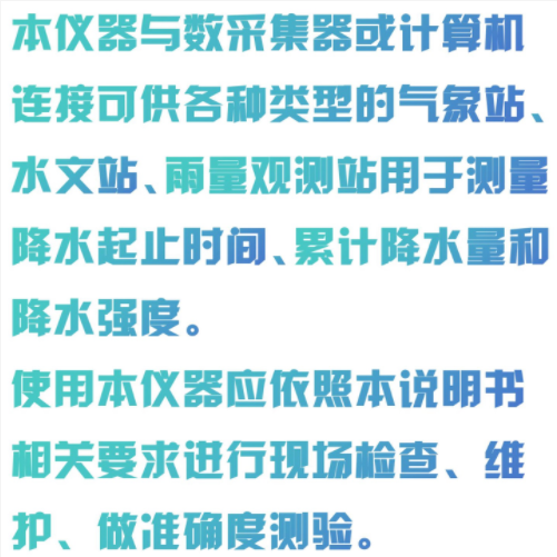 本儀器與數(shù)采集器或計(jì)算機(jī)連接可供各種類(lèi)型的氣象站、水文站、雨量觀測(cè)站用于測(cè)量降水起止時(shí)間、累計(jì)降水量和降水強(qiáng)度。